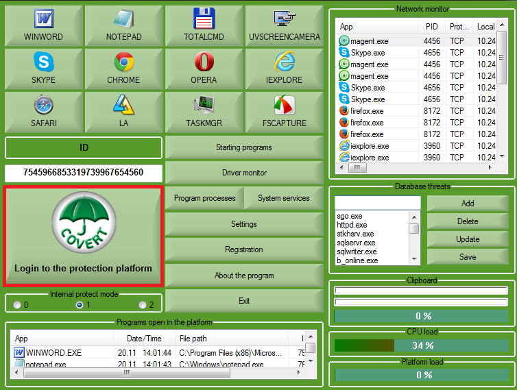 COVERT Pro bilgisayarda çalışırken tamamen gizlilik sağlayan bir programdır. Program ajan yazılımlara karşı bir çözümdür. Güvenli bir platformda çalışırken kullanıcının tüm programlardaki hareketleri (browsers, email clients, office software, messengers, vbc.) güvenle gizlenmektedir. Klavyedenve ekrandan bilgi edinmek imkansızdır. COVERT Pro’nun özel fonksiyonları sayesinde (Network monitor, Driver monitor, System processes, System services) tüm uygulamalar gizli kalmaktadır.