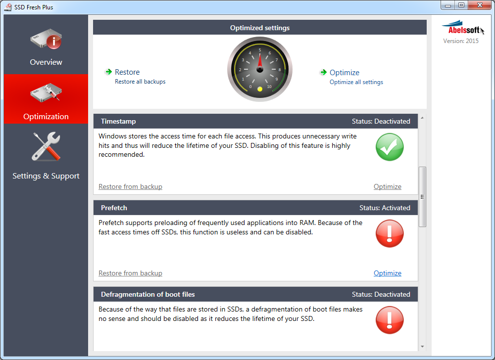 SSD fresh 2015 ile SSD sürücünüzün yaşamını artırır. Sisteminizi SSD’ye göre ayarlayın ve performansını artırın. SSD Fresh Windows sistemini SSD kullanımına göre ayarlar, okuma, yazma sayısını azaltır, gereksiz servisleri kapatarak sürücünüzün yaşam süresini artırır.