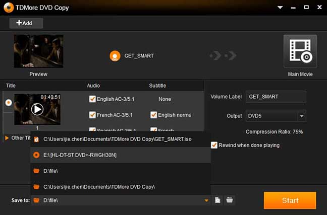 TDMore DVD Copy kullanıcılara DVD yedeklemenin pek çok değişik yolunu sunan, yeni ve güçlü bir DVD kopyalama programıdır. Dört kopyalama yöntemi vardır: tam disk, ana film, klon ve kişiselleştirilmiş. Bu DVD Kopyalama programı ile aşağıdaki görevleri hızlı ve yüksek kalite ile gerçekleştirebilirsiniz.