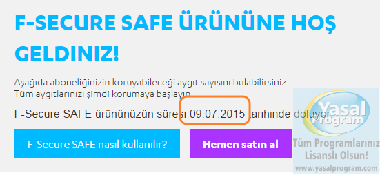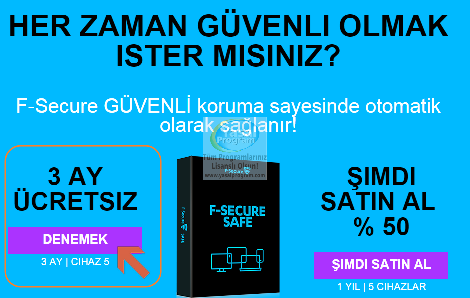 F-Secure SAFE, PC ve mobil kullanıcılar için yeni bir güvenlik hizmeti ve yazılımıdır. Tüm cihazlar arasında tek bir birleşik güvenlik deneyimi sahip olmanız için F-Secure firması ödüllü teknolojilerini bir araya getiriyor. Artık tek bir hizmet ile tüm ailenizi online olarak koruyabilirsiniz. F-Secure SAFE, PC, Mac, akıllı telefonlar ve tabletler için size İnternet güvenliği sağlar. F-Secure SAFE ile korumak istediğiniz cihazların sayısına göre, abonelik seçebilirsiniz. (yasalprogram.com) Kurulum basit ve hızlıdır. Malware, korsanlara ve kimlik hırsızlığına karşı tüm cihazlarınızı korur. Ebeveyn Kontrolü sayesinde, çocuklarınızın her zaman güvendedir. Akıllı telefon ya da tabletinizin kaybolması ya da çalınması durumunda, F-Secure SAFE cihazlarınızı kolayca bulmanıza yardımcı olur. Güvenli bir şekilde İnternette sörf, bankacılık ve alışveriş yapabilirsiniz. F-Secure SAFE tüm aile için dijital bir özgürlük sunar.
