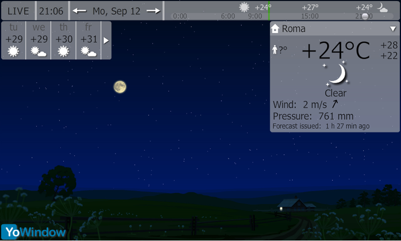 YoWindow, hava durumu izleme uygulamasıdır. Huzurlu bir manzara ve güzel görüntüler eşliğinde bir pencereden dışarı bakıyormuş gibi hava şartlarını canlı izleyebilirsiniz. Sade hava durumu verileri yerine animasyonlu resim eşliğinde eş zamanlı hava durumu gösteren konusunda bir ilk sunan tek programdır.Türkçe dil desteği olan yazılım, ülkemizdeki şehirlerden köylere kadar her il, ilçe ve beldenin hava durumunu ayrıntılı şekilde gösterir. Ayrıca programı ekran koruyucu olarak da ayarlama olanağınız bulunmaktadır.