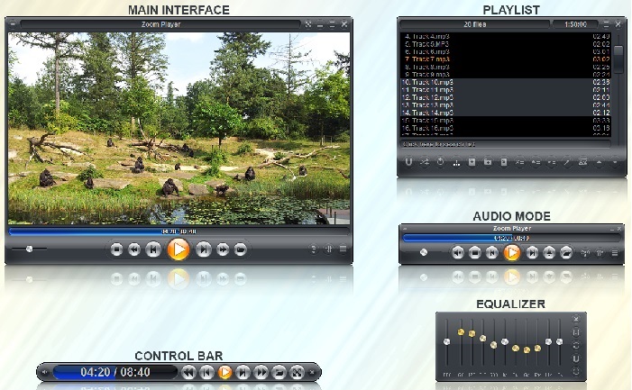 Zoom Player’in klasik medya oynatıcı görünümün ardında 5 anahtar özelliğe sahip tam ekran navigasyon arayüzü ile tasarlanmış güçlü bir Media Center uygulaması gizler. 5 anahtar özellikli sistemi gelişmiş arayüzler ile basit ama çok işlevli bir kullanım sağlar. Ortam Kitaplığı, Dosya Yöneticisi, Çalma Listesi, Renk Kontrolü, Ses Ekolayzırı, Yer imleri, Geçmiş Oynanan Listesi ve daha birçok özelliği ve kolay kullanımlı arayüzü sayesinde her videonuzu keyifle izleyebilirsiniz. Zoom Player’in medya merkezi basittir ve kullanıcılar için idealdir.