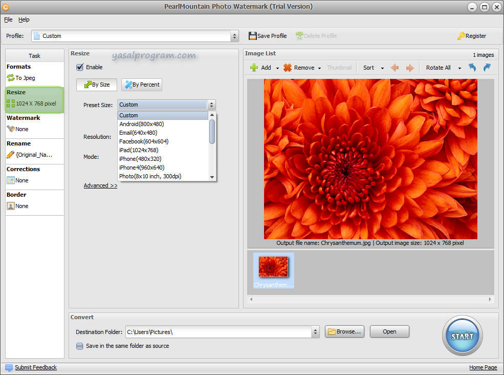 - Web, e-posta, fotoğraf baskısı, Facebook, MySpace, cep telefonu, vb gibi, herhangi bir farklı kullanım için görüntüyü yeniden boyutlandırın