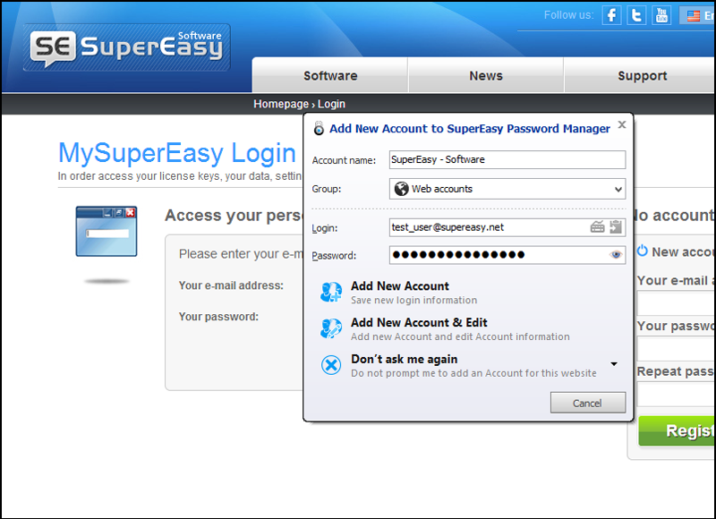 Güçlü parolalar, kimlik hırsızlığı ve kişisel bilgilerinizi çalmaya çalışan keyloggers’lara karşı gereklidir. İster Facebook, Amazon, online bankacılık, alışveriş, e-posta, veya online gıda siparişi için her web sitesi sizden bir kullanıcı adı ve şifre ile bir hesap oluşturmanızı istiyor, satın almadan önce oturum açmak için zaman zaman çoğu insan şifreleri hatırlamakta zorlanır. SuperEasy Password Manager kullanıcı adlarını ve şifreleri size hatırlatır. Siz Sadece bir ana parola seçin , SuperEasy Password Manager otomatik olarak favori web sitelerine girmenizi sağlar.