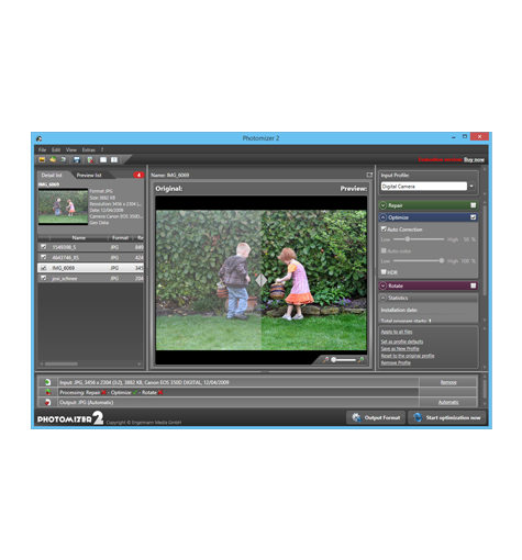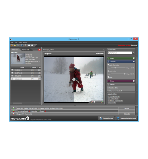 Photomizer 2, amatör veya profesyonel fotoğrafçıların çok hoşuna gidecek kullanışlı bir fotoğraf optimize ve düzenleme programıdır. Photomizer 2 ile zahmetli fotoğraf düzenleme eğitimi almanıza gerek olmadan dijital fotoğraflarınızı onarabilir ve tam güvenli bir şekilde resimlerinizi otomatik olarak optimize edebilirsiniz. Fotoğraflarda sizi rahatsız eden görüntü bölümlerini düzenleyebilir, resimleriniz için en uygun ayarları seçebilirsiniz.