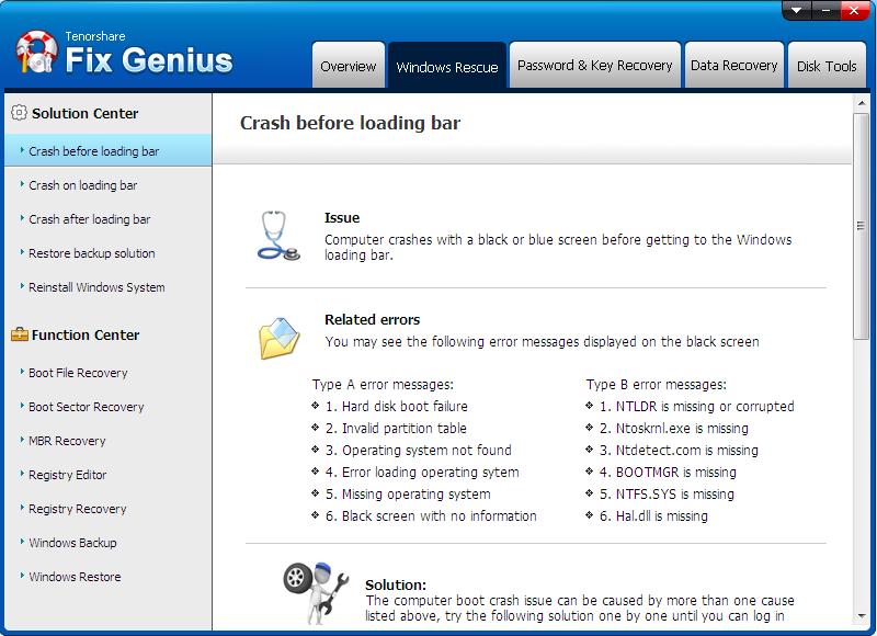 Tenorshare Fix Genius, kolay kullanımlı bir arayüzü sahiptir ve farklı sistem kurtarma ve onarma araçları ile tüm sistem sorunlarınıza çözüm getirmenizi sağlar. İçerisinde barındırdığı farklı sistem araçları ile yaşanabilecek sistem sorunlarında size birçok kurtarma seçeneği sunacaktır. Mavi veya siyah ekran hataları gibi tüm önyükleme sorunlarını düzeltebilir, sistem çökmelerini neden olan sorunları tamir edebilirsiniz. (yasalprogram.com) Çöktüğü veya sistem hataları sebebiyle açılmayan bilgisayarınıza Windows CD, DVD veya USB ile boot ederek erişebilirsiniz. İçerisinde barındırdığı toplam 40’tan fazla programlar ile sisteminizdeki önemli verileri kurtarabilir, kayıp Windows şifresi ve Office ürün anahtarını bulabilir, kayıp disk verilerini ve bölümlerini geri getirebilir, ya da diskinizi kopyalayarak kurtarabilirsiniz.