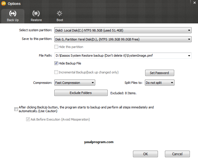 Tam yedekleme ve bölümlü yedeklemeyi destekler ve birden fazla geri yükleme noktaları kullanılabilir. Yedek dosyaları için parola korumalı olabilir, istenmeyen sistem geri yüklemeyi önleyebilirsiniz.