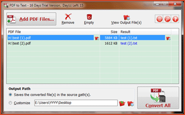 PDF to Text toplu iş modunda PDF belgelerini düz metin dosyalarına dönüştürür. Kullanıcı dostu arayüzü ve doğru dönüşüm yeteneği ile küçük bir programdır. Adobe Acrobat veya Adobe Reader olmadan çalışır ve mümkün olduğu kadar doğru orijinal metin biçimini ve düzenini korur.