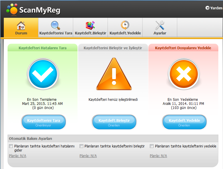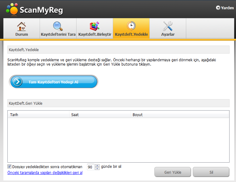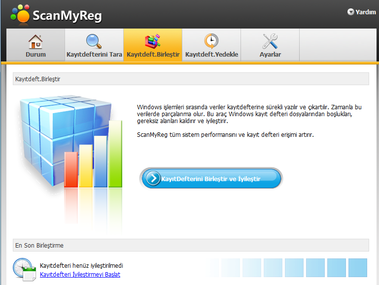 ScanMyReg piyasadaki en hızlı ve en etkili kayıt defteri optimizasyon aracıdır. Windows kayıt defterini tarar ve yanlış veya eski bilgileri kayıt defterinde bulur. Windows kayıt defterinde bulunan bu gereksiz bilgileri tamir eder ,sistemin daha hızlı ve hatasız çalışmasını sağlar. Ayrıca diski birleştirir ve kayıt defteri düzenli tutarak , akıcı sistem performansı sunar. Yedekleme/geri yükleme aracını karşılaştığınız bazı sistem hataları gibi durumunda geçerli kayıt durumuna geri dönmek için kullanabilirsiniz. Yazılım tüm Windows kayıt defterinin yedeklemenizi sağlar. Türkçe dil desteği bulunuyor.