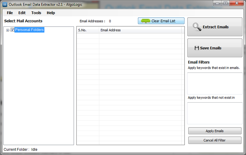 Outlook Email Data Extractor, Microsoft Outlook içinde yapılandırılmış tüm e-posta hesap adreslerini filtre yöntemi ile ayıklamanızı sağlar. Mail adreslerinin tümünü kolayca ayıklayıp dışa aktarabilirsiniz.