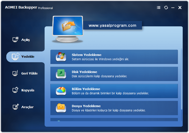 AOMEI Backupper Professional, ev ve iş kullanıcıları için, güvenilir ve kolay kullanımlı bir yedekleme ve kurtarma yazılımıdır. Güvenli yedekleme için tüm sistemi ve sistem bölümlerinin yedeklemesini tek tıklama ile gerçekleştirmenizi sağlar. Masaüstü PC’ler, dizüstü bilgisayarlar ve iş sistemleri için komple Windows sistem yedekleme yapabilirsiniz. Veri kaybını önlemek için bilgisayarınızı AOMEI Backupper ile koruyabilirsiniz… Türkçe dil desteğine sahiptir.