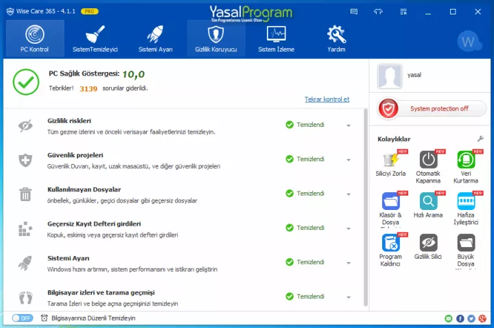 Wise Care 365 Pro, kullanıcıların kesinlikle istediği tüm sistem bakım araçlarına sahiptir. Windows sistemli bilgisayarların performansını en üst düzeyde tutmak isteyenlerin vazgeçilmez bir bakım yazılımı haline gelmiştir. Geçersiz Windows kayıt defteri girdilerini, gereksiz dosyaları, indirme geçmişini, tarama geçmişi, geçersiz kısayolları, tarayıcı izlerini, önbelleği, İnternet çerezlerini, kayıtlı parolaları, Windows bileşenlerini, belirli uzantılara sahip dosyaları vb. gibi istediğiniz tüm gereksiz verileri kolayca temizleyebilirsiniz. Gereksiz veri ve sistem kalıntılarını temizleyerek sabit diskinizde yeni boş alanlar açabilir, yaptığınız temizlik ile Windows sisteminizi daha hızlı çalışır duruma getirebilirsiniz. Türkçe dil desteğine sahiptir.
