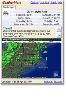 WeatherMate �cretsiz bir Hava Durumu g�sterge arac�d�r. Hava durumu bilgilerini masa�st�n�zde g�sterir. R�zg�r, nem seviyesi, g�r�n�rl�k, �i� olu�umu, s�cakl�k, g�ne�in do�u� ve bat�� zaman� gibi hava durumu bilgilerini size sunar.