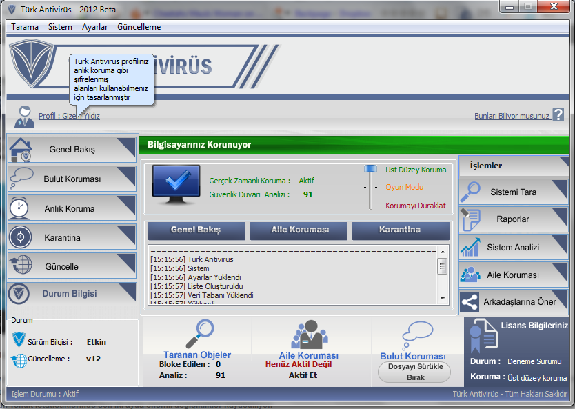 Neden Profil Olu�turmal�y�m?T�rk Antivir�s yaz�l�m�n�n Anl�k koruma ve yaz�l�m�n bir�ok �zelli�ini etkili bir �ekilde g�venli�inizi �st d�zeyde korunmas� i�in Profil kimli�inizi olu�turmal�s�n�z. Profilinizi Olu�turdu�unuz an itbari ile siz d���nda her hangi bir birey T�rk Antivir�s yaz�l�m�n�z�n ayarlar�n� de�i�tiremez Anl�k koruma gibi ki�isel bilgilerinizi g�remez bir hal i�erisinde tutar.