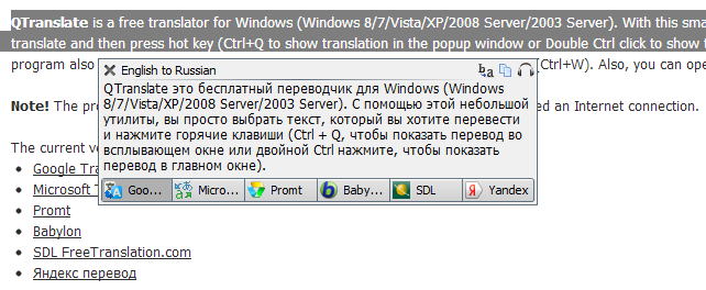 Ge�erli s�r�m �u �eviri hizmetleri destekliyor: Program kurulumu sonras� sistem tepsisinde bulunan ikonu t�klay�p maus modunu se�ili hale getirmeniz yeterli ,bu i�lem sonras� se�ili hale getirdi�iniz yaz�n�n yan�nda program ikonu belirecek bu ikona t�klad���n�zda se�ili alandaki yaz�lar otomatik �evrilecektir,dilerseniz bu �eviriyi kopyalay�p alabilir yada di�er �eviri hizmetlerini se�ip kullanabilirsiniz.