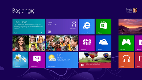 Tek bir bak��ta canl� g�ncellemelerT�m canl�l��� ve g�zelli�iyle ilk �nce Ba�lat ekran�n� g�receksiniz. Ba�lat ekran�ndaki her kutucuk sizinle ilgili bir ki�i, uygulama, web sitesi, �alma listesi ya da sizin i�in her ne �nemliyse onunla do�rudan ba�lant�l�d�r. Her an g�ncel kalabilmeniz i�in canl� kutucuklar en son bilgiyle ayd�nlan�r. Etiketlendi�iniz foto�raf�, ertesi g�n�n hava durumunu ve arkada�lar�n�zdan gelen iletileri tek bak��ta g�r�rs�n�z.