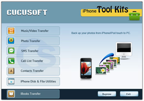 Cucusoft iPhone Tool Kits can easily backup and transfer iPhone songs, videos, photos, SMS, call list, contacts and books(you purchased via iBook Store) to computer. And even enable your iPhone as a removable hard disk.