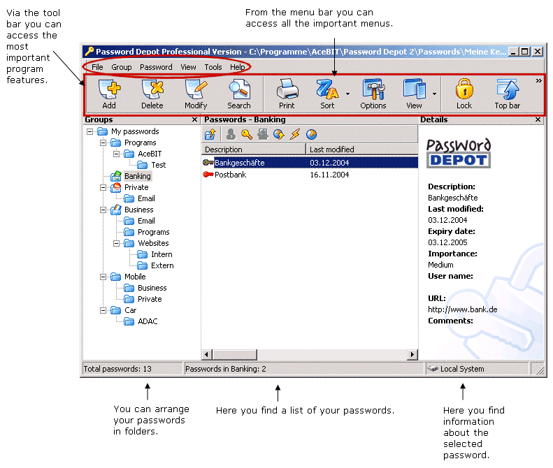 Password Depot, kullan�c� adlar�n� ve �ifrelerini saklamak isteyen kullan�c�lar�na g�venli bir ortam sunan �ifre y�netici program�d�r. Grup �zelli�i ile farkl� kullan�c� hesaplar�n�z� organize edebilip ve h�zl� bir �ekilde bulabilir. Ayr�ca program kullan�c� ad�, �ifre veya URL kopyalamak isterseniz an�nda yard�mc� olabiliyor. H�zl� bir �ekilde �ifre de�i�tirebilir, yazd�rabilir ya da silebilir.