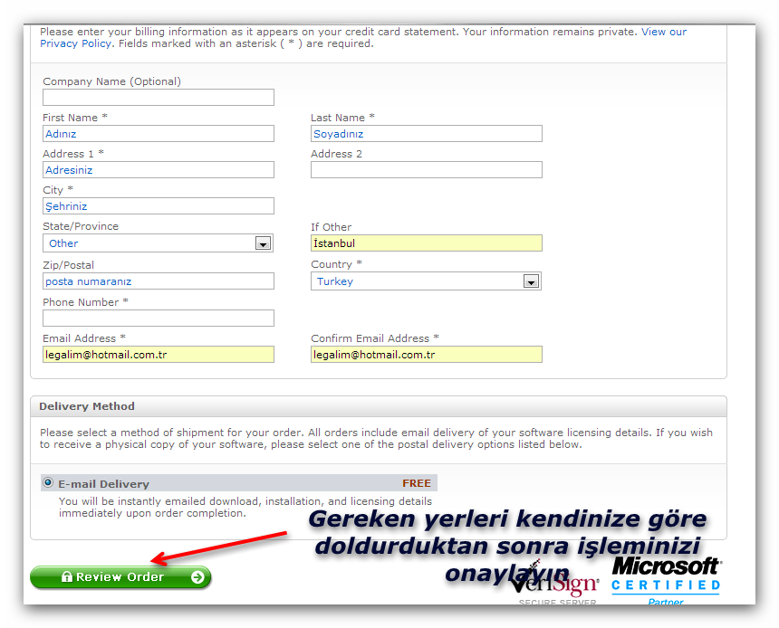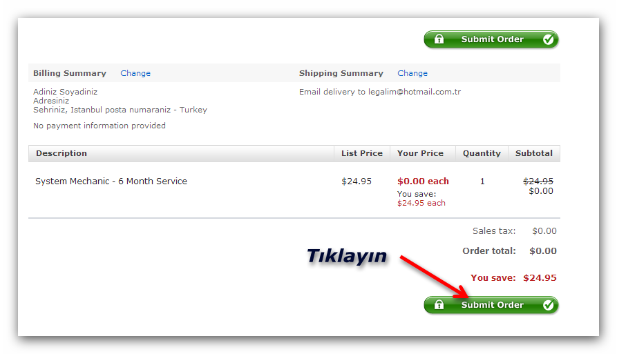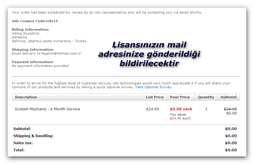 Secure Checkout" yazan ye�il renkteki butona t�klay�n. A��lacak sayfadaki doldurulmas� gerekli bo� alanlar� doldurup i�leminizi onaylay�n. Program�n 6 ayl�k lisans anahtar� mail adresinize g�nderilecektir.