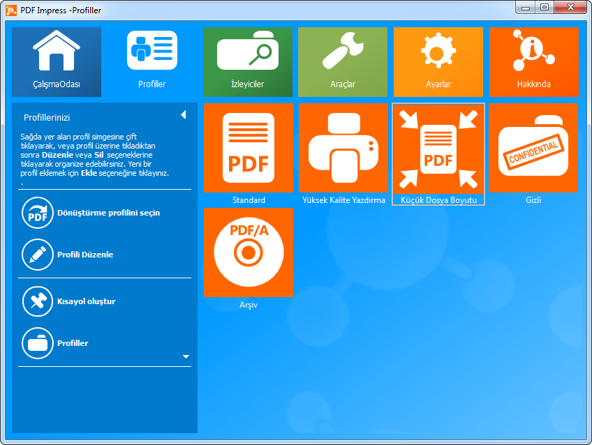 PDF Impress 2014 m�thi� bir PDF yaratma ve de�i�tirme arac�d�r. Program pek �ok yolla Adobe PDF dok�man� yaratmaktad�r. Kullan�c� basit�e sa� t�kla veya masa�st�ndeki PDF k�sayoluna ta�� b�rak y�ntemiyle �al��t�rabilir. PDF Impress sanal yaz�c�s� yaz�c� ��kt�s� alabilen her programda PDF yaratabilmenizi sa�lamaktad�r.