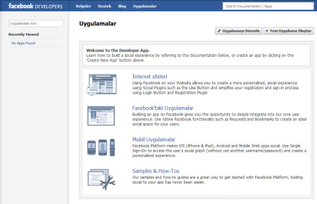 Facebook'da geli�tirici olmak ise sadece 5-10 dakikal�k bir i�. Bunun i�in Facebook'un arama kutucu�unda "Geli�tirici" s�zc���n� arat�n. Yukar�daki gibi bir g�r�nt� elde edeceksiniz. �lk sonuca t�klay�n. Temel geli�tirici ekran� a��lacakt�r;