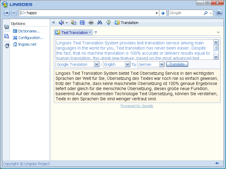 kolay ve sezgisel bir s�zl�k ve metin �eviri yaz�l�m�d�r, arama, s�zl�kler, tam metin �evirisi sunar, ekranda kelime yakalama ile se�ili metni 80'den fazla dilde kelime veya telaffuzunu �evirir . Bu diller